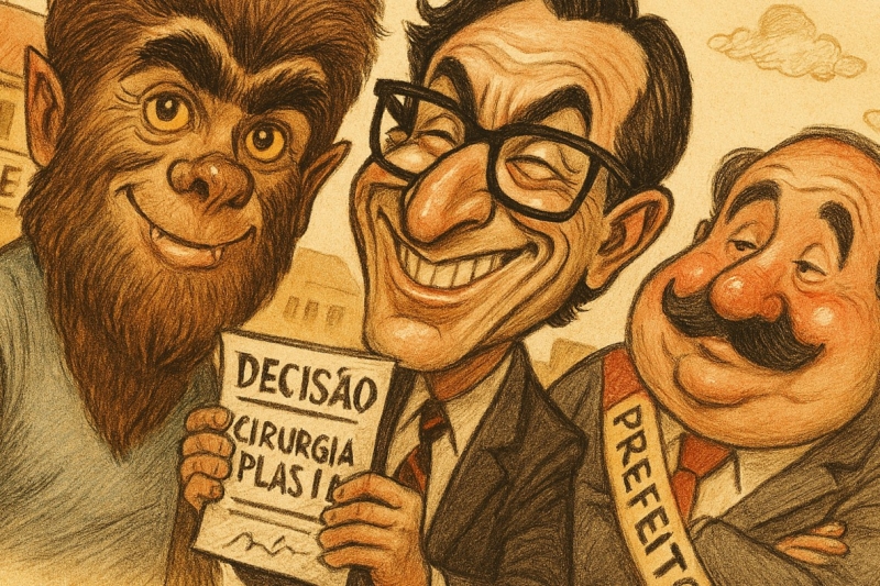 Foi então que entrou em cena o doutor advogado — figura quase tão lendária da cidade quanto o próprio rapaz assim que começou a frequentar a escola local. Movido por seus deveres legais, um toque de criatividade jurídica e uma grande vontade de aparecer nas redes sociais, propôs uma ação de obrigação de fazer contra o hospital, exigindo a realização de uma cirurgia plástica que transformasse o jovem em um adolescente “normal”. Na petição inicial, o advogado requereu tutela de urgência, argumentando que a solteirice do rapaz e o bullying escolar justificavam a pressa. O juiz, impressionado ao conhecer o autor da ação em uma audiência de justificação, dispensou a caução e autorizou a cirurgia de forma imediata.