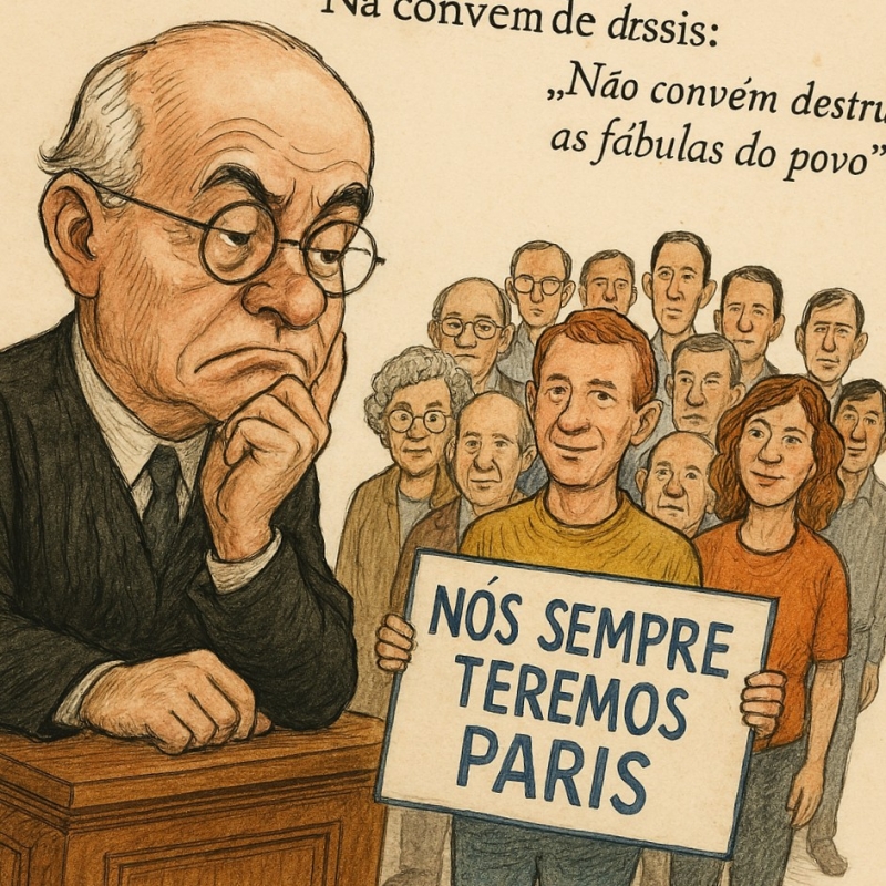 E foi então que, em uma tarde fria de terça-feira, o fórum recebeu uma romaria insólita. Eram vinte e três autores, cada qual com seu documento em mãos. À frente do grupo, uma placa improvisada, escrita com caneta azul: “Nós sempre teremos Paris.”
