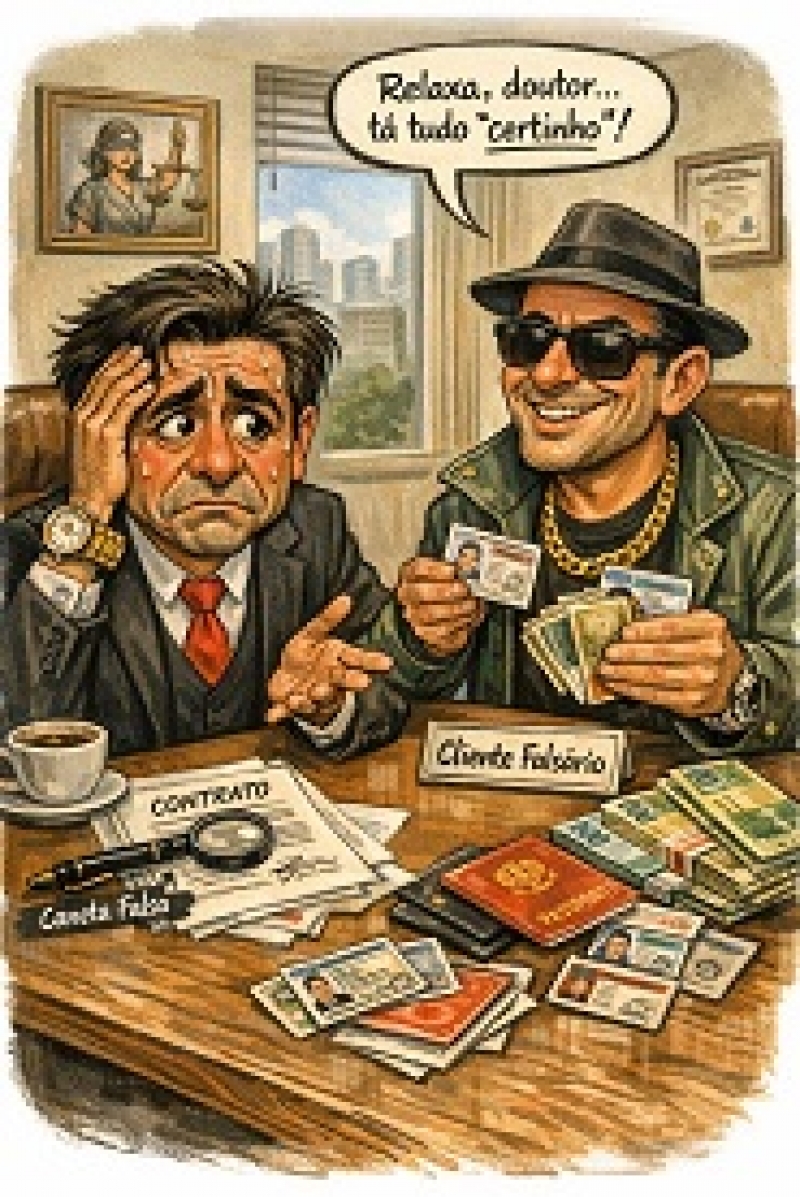 Após as apresentações de praxe, o cliente perguntou se a conversa seria sigilosa. O advogado, demonstrando conhecimento técnico, citou o artigo do Código de Ética que garante o sigilo profissional. Foi então que veio a surpresa: o cliente era, na verdade, um falsário. Passando-se por advogado, aplicara golpes milionários na cidade vizinha. Chegava a inventar audiências, capturar fotos e vozes, e assim multiplicava suas vítimas. Sabia que estava sendo investigado e queria contratar o jovem doutor para sua defesa.
