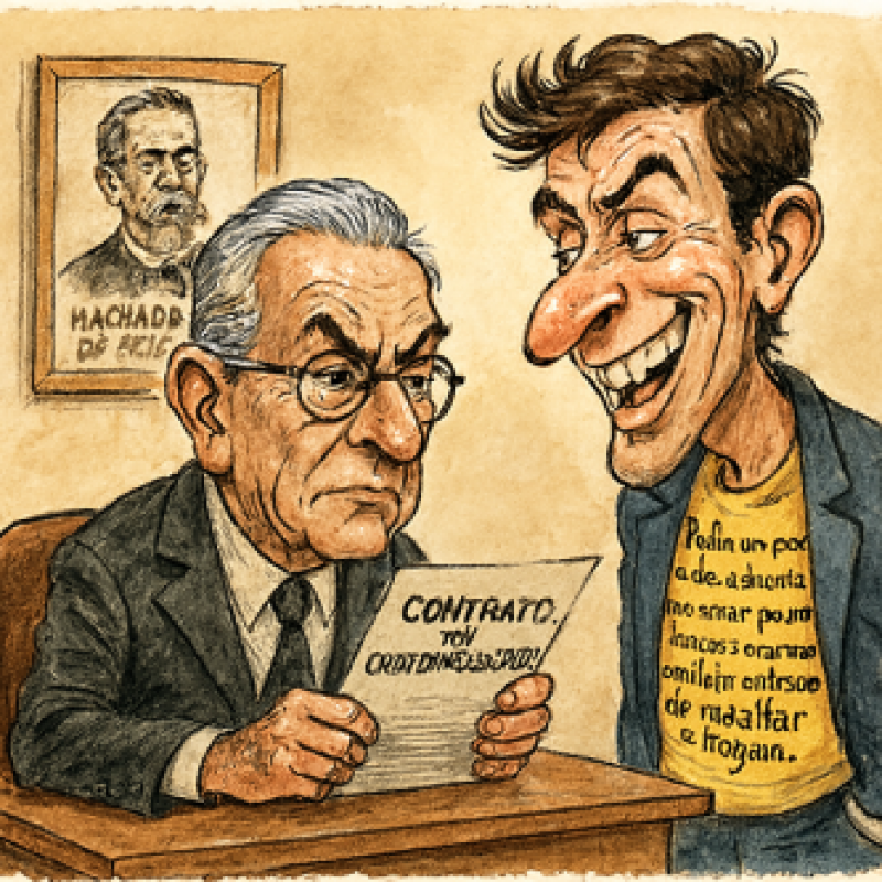 Após o contrato ser enviado ao interessado e assinado, sem qualquer questionamento, o advogado sorriu satisfeito. Afinal, se não fosse possível provar judicialmente a má-fé, ao menos seria possível rir dela — e transformar o contrato em uma obra literária digna de figurar na vitrine da própria franquia. Depois disso, decidiu-se que não enviaria mais nenhum documento com dados sigilosos ao tal interessado, já que, como diria Machado de Assis, “Antes da prova material, valem as conclusões do espírito”. E como não havia cláusula penal a ser exigida em favor de sua cliente, o doutor advogado deu o caso por encerrado. Afinal, não se tratava de litígio, mas de mera tentativa de arruinar o sucesso de sua cliente travestida de negociação. E, em gesto de fina ironia, resolveu transformar as próprias frases do interessado em material para uma nova franquia literária — porque, se não rendia ação judicial, ao menos rendia camiseta estampada com doutrina de Machado de Assis.