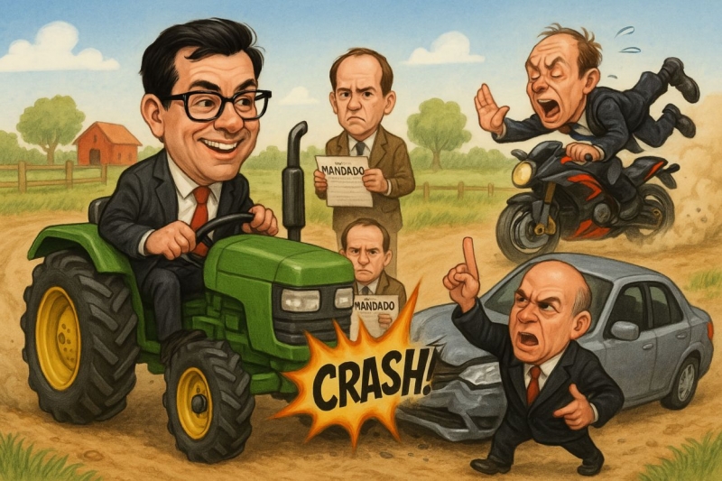 Resultado? O trator, que vinha em marcha lenta, colide justamente com o carro do juiz — o mesmo que assinara a autorização para a remoção. E, por um azar do destino, a motocicleta que o promotor de justiça pilotava escorrega, deixando seu motociclista estirado no chão.