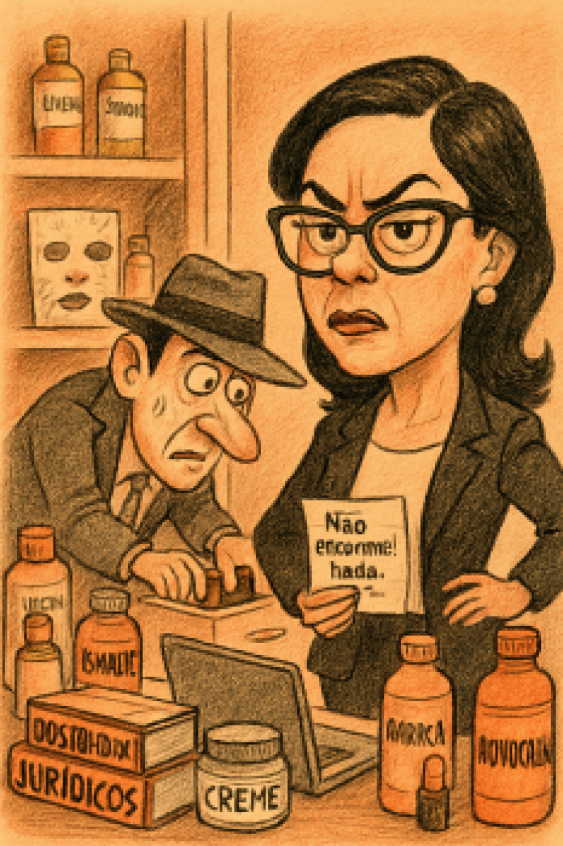 O apartamento da doutora advogada era um verdadeiro spa. Havia máscaras faciais empilhadas junto com os livros jurídicos de Carlos Alberto Bittar, João da Gama Cerqueira, e entre outros que escrevia sobre concorrência desleal, além de caixas de esmalte com literatura de Dostoiévski e shampoos — muitos shampoos — espalhados por todos os cômodos da casa. O doutor advogado passou a noite inteira vasculhando cada canto, tentando não levantar suspeitas. Abriu gavetas, mexeu em porta-retratos, fingiu procurar cremes; na verdade, buscava algum documento que comprovasse a composição fiel daqueles novos produtos. O problema é que a advogada, um tanto desconfiada, escondia documentos com a mesma habilidade com que escondia rugas — ninguém jamais encontrava.
